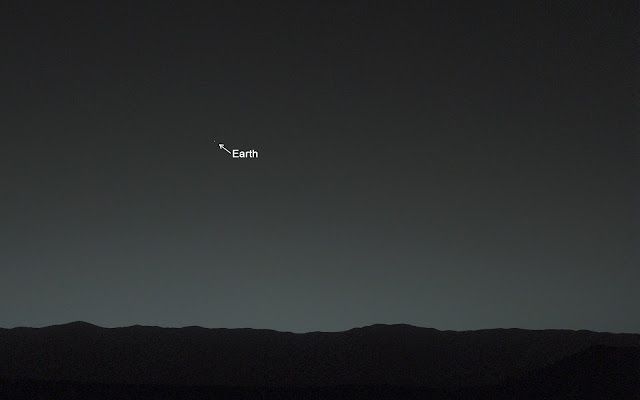 تظهر هذه الصورة التي أخذتها مركبة «مسبار» Curiosity Rover التابعة لوكالة ناسا [1] ، الأرض كما صُورت من على سطح المريخ، وهي أكثر إشراقًا من أي نجم في سماء ليل المريخ. الأرض هي النقطة الساطعة على اليسار قليلاً من مركز الصورة ويمكن رؤية قمرنا أسفل نقط الأرض مباشرةً. مركبة كيوريوسيتي، التي هبطت على الكوكب الأحمر في 6 أغسطس 2013، هي أكبر مركبة لاكتشاف الكواكب وأكثرها تقدمًا على الإطلاق ارسلت إلى المريخ لدراسة جيولوجيا المناطق المحيطة بالمركبة ووجدت قرائن على وجود بيئة سابقة كانت مناسبة تمامًا لدعم الحياة الميكروبية.