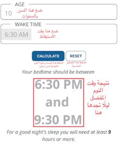 صورة شاشة مقتطعة لحاسبة فترة النوم حسب السن وساعة الاستيقاظ صباجًا. المصدر: الرابط أعلاه.