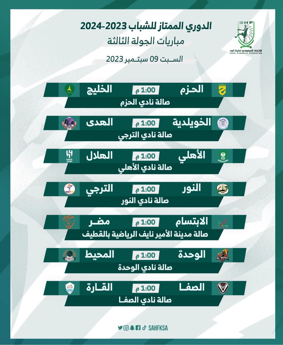 تجري يوم غداً السبت 09 سبتمبر 2023م مباريات الجولة الثالثة من بطولة الدوري السعودي الممتاز لكرة اليد لدرجة الشباب، بإقامة سبع مباريات، وستكون جميعها في نفس التوقيت عند الساعة 1:00 مساءً.