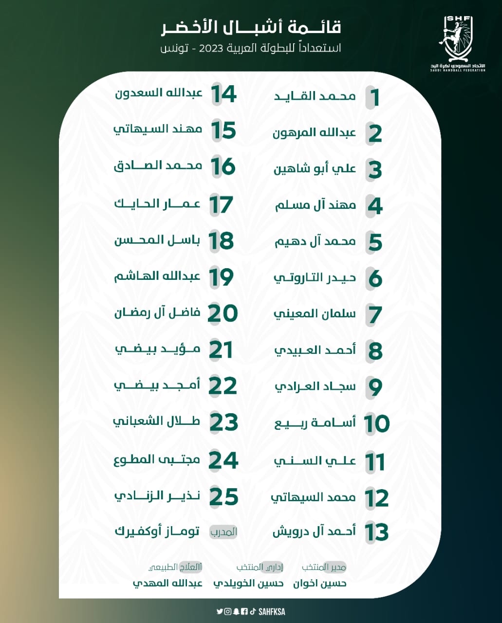 ويدير الدفة الفنية لأشبال الأخضر المدرب السلوفيني ”توماز أوكفيرك“، ومدير المنتخب الدولي السابق حسين اخوان، والإداري حسين الخويلدي، وأخصائي العلاج عبدالله آل مهدي، وتضم القائمة المشاركة في المرحلة الثانية من الاستعدادات 25 لاعباً وهم: