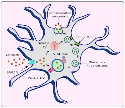 افراز الغلوتامات من الخلايا النجمية عن وذلك بالإخراج الخلوي «الإيماس» المتواسط بأيونات الكالسيوم الموجبة 2+Ca المصدر https://www.mdpi.com/2073-4409/11/7/1139