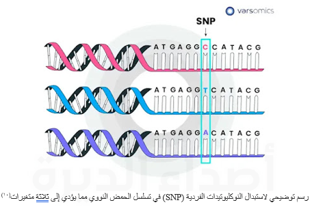 رسم توضيحي لاستبدال النوكليوتيدات الفردية «SNP» في تسلسل الحمض النووي مما يؤدي إلى ثلاثة متغيرات [10]