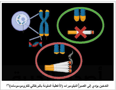 التدخين يؤدي إلى اقصير التيلوميرات «الأغطية الملونة بالبرتقالي للكروموسومات» [3]