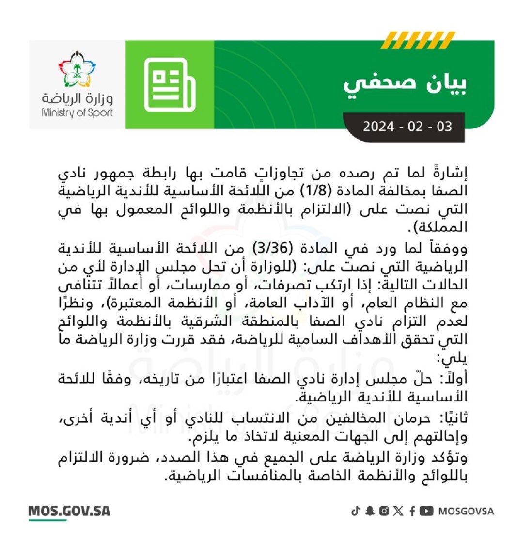 أعلنت وزارة الرياضة اليوم عن حلّ مجلس إدارة نادي الصفا في المنطقة الشرقية، وذلك إثر رصد تجاوزات قامت بها رابطة جمهور النادي.