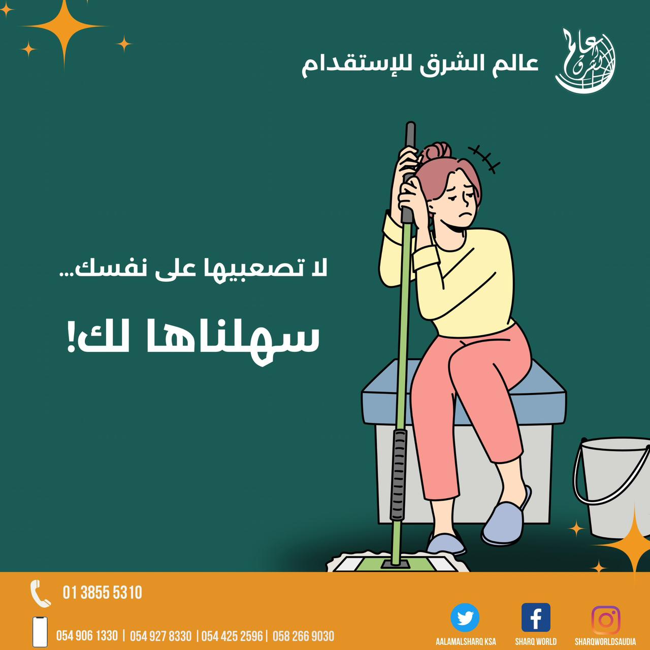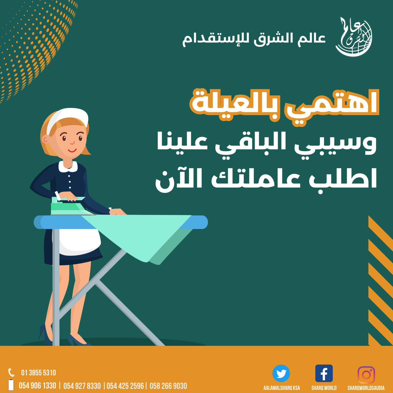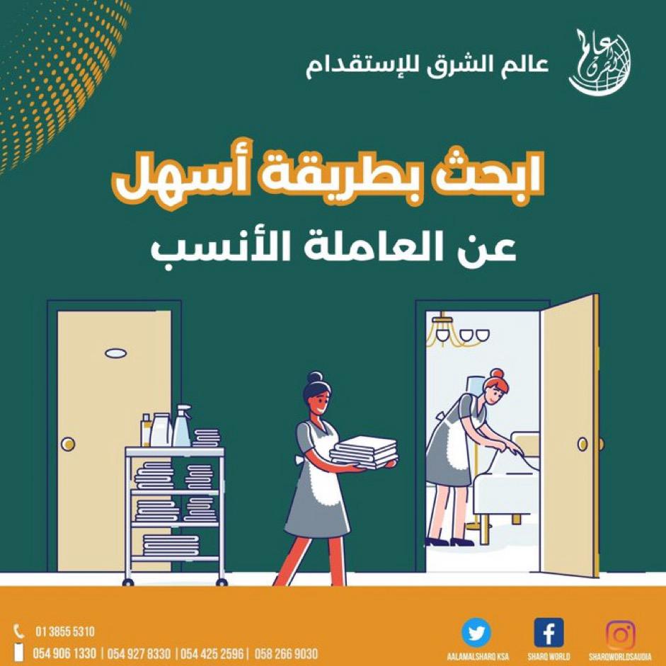 ”عالم الشرق للإستقدام“ مكتب إستقدام سعودي يعمل في إستقدام العمالة المنزلية والمهنية مرخص من قِبل وزارة الموارد البشرية والتنمية الإجتماعية ترخيص رقم «3804449».