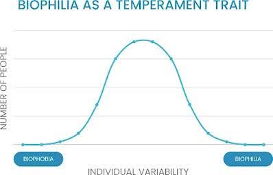 أفكار وودز ونوث مهمة. على الرغم من أنني لست مقتنعًا تمامًا بأن مصطلح البيوفيليا يحتاج إلى إعادة تعريف باعتباره عامل جذب لبيئات متنوعة من الناحية البيولوجية، إلا أن دراستهما جعلتني أفكر في سبب كون بعض الناس من محبي الطبيعة والبعض الآخر ليسوا كذلك. والمثير للدهشة أنه لم يكن هناك الكثير من الدراسات في هذا المجال. ومع ذلك، درس الباحثون اليابانيون [13] الفروق الفردية في أنشطة الجهاز العصبي الذاتي «التلقائي» [14] المرتبطة بإجهاد القلب [15] عندما كان الناس في بيئات طبيعية مقابل كونهم في مناطق حضرية. عانى معظم الشباب الراشد البالغ عددهم 650 شابًا في دراستهم مستويات منحفضة من إجهاد القلب [15] عندما تم فحصهم في بيئة غابات. ومع ذلك، 20% منهم كان مستوى أجهاد القلب لديهم حين كانوا بين الأشجار أعلى من مستوى اجهاد القلب حين كانوا في مناطق حضرية. علاوة على ذلك، كما توقعت وودز ونوث، فإن الاختلافات في مستوى إجهاد القلب في البيئات الحرجية «الغابة» والحضرية كانت متماشية بشكل جيد مع شكل منحنى الجرس الغاوسي Gaussian curve.
