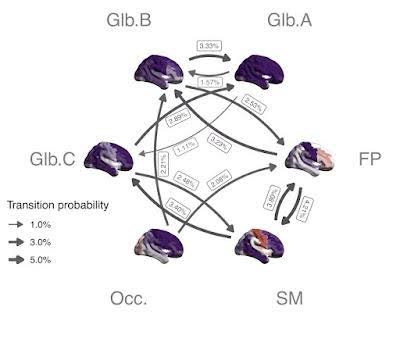 نمط نموذجي من التحولات بين حالات الاتصالية الست في الدماغ التي تم التعرف عليها في الدراسة.