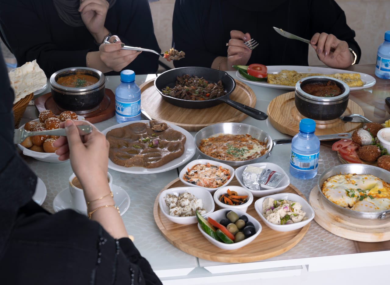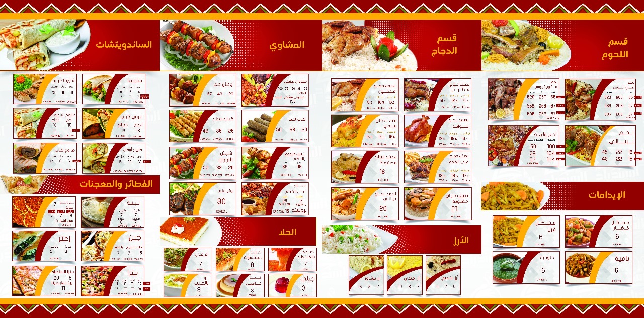 جميع أنواع الرز لحم /دجاج،  ومشويات وشاورما وبروستد ومختلف أصناف المقبلات «حمص، متبل، فتوش، سلطة خضراء، تبولة وغيرها»، بالإضافة إلى الإيدامات مرق الخضار والبامية، وكذلك الشوربة والملوخية وأنواع المعجنات.