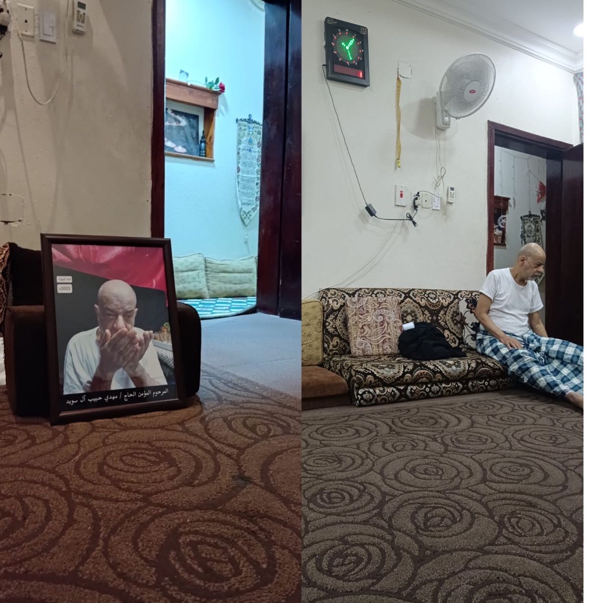 حين التسليم وشعور الوالد للرحيل للأحبة، غاب عن أهل الدنيا في الصلاة والنوم والبيت، حتى عن أقرب من هم لقلبه: أخيه وابنه وصديقه ”حسين حبيب“.