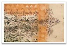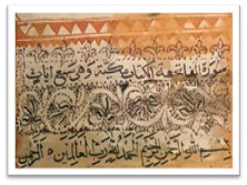 - الثاني: زخرفة نباتية تنسدل من وسط نصف القوس العلوي بأسلوب فني جميل مرسوم بأسلوب التنقيط باللون الأسود لزخرفة نباتية ذات براعم جانبية أقرب لزهرة الزنبق مطعمة باللون البرتقالي السائد في بقية الصفحات.