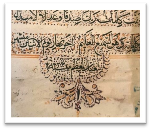 - الأولى: في الأعلى على شكل زخرفة نصف دائرية تتوسط منتصف الصفحة مطرزة بخطين افقيين من نفس لون الخطوط البرتقالية الرأسية لتحديد نهاية الآية، وهذا الشكل النصف دائري محدد دورانه بأقواس صغيرة متتالية مرسومة بأسلوب التنقيط باللون الأسود ومطعمة بنقط برتقالية على الجوانب