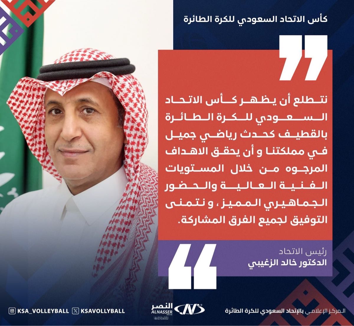 الجدير بالذكر، إن سعادة د. خالد الزغيبي رئيس الاتحاد السعودي للكرة الطائرة وسعادة نائبه الأستاذ سعد الرويس، وكل الأعضاء الكرام، يتطلعون بكل شفافية، أن تكون في هذه المرحلة الختامية، أيام جميلة للرياضيين وكحدث رياضي بمملكتنا الحبيبة بين جماهير الرياضة وعشاقها في القطيف الغالية، قطيف المحبة والوفاء، وهو كما عبر عن هذا الحدث الرياضي سعادة الرئيس د. الزغيبي ”بالجميل“ متمنياً أن يحقق الأهداف المرجوة من خلال المستويات الفنية العالية والحضور الجماهيري المميز، وتمنى سعادته مشكوراً التوفيق لجميع الفرق المشاركة، ولا يفوتنا ما تقدم به أعضاء الاتحاد السعودي للكرة الطائرة، الأستاذ عبدالمحسن العبيد والأستاذ إبراهيم آل إبراهيم، بتقديم الشكر الجزيل والثناء الكبير، لرئيس وأعضاء مجلس إدارة مؤسسة النصر الرياضية الراعي الرسمي لكأس الاتحاد السعودي للكرة الطائرة، وسوف تكون الإثارة حاضرة بإذن الله تعالى ومفاجئات سعيدة لجمهور الرياضة ووقتاً ممتعاً، وتنافس رياضي كبير وحضور مميز لجماهير اللعبة الأنيقة كرة الطائرة.