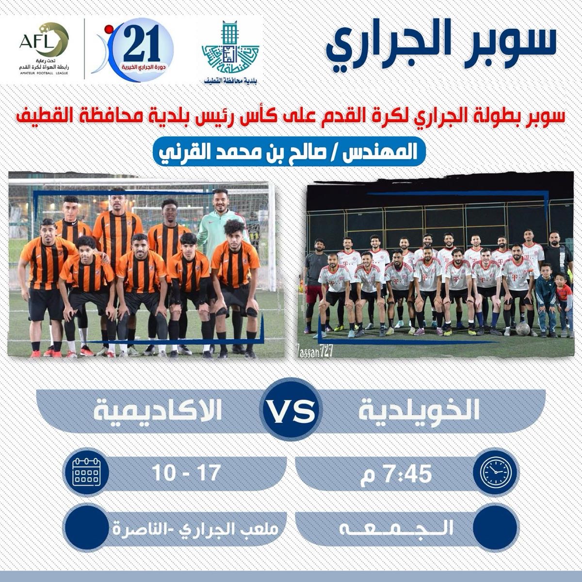 ويلتقي فريق الأكاديمية بطل بطولة الجراري بنسختها ال 20، وفريق الخويلدية بطل بطولة الإحسان الرمضانية.