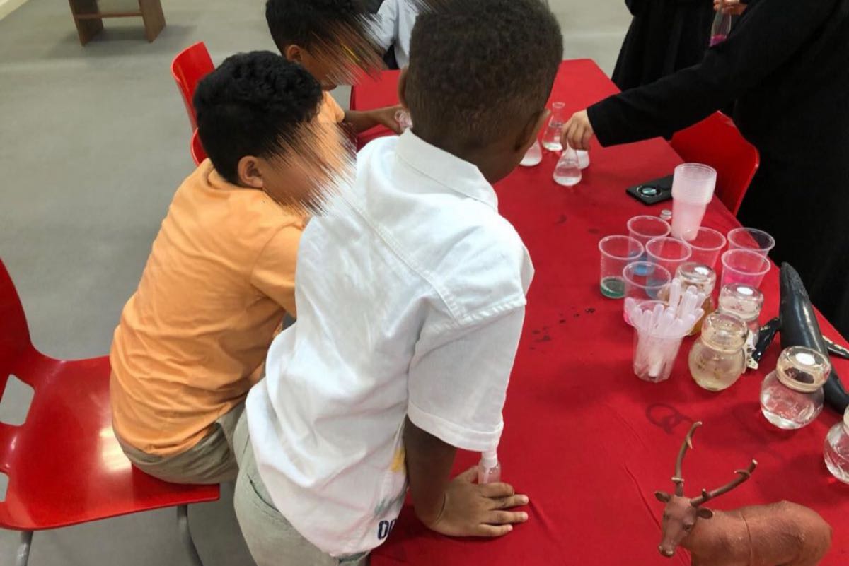 وتعرّف الأطفال على كيفية تركيب العطور وصناعتها، حيث قام كل طفل بتركيب العطر الخاص به، وتعبئته في زجاجته ليأخذها للذكرى، إضافةً إلى تجربة تغير لون الماء، وتلوين صور للأدوات المختبرية، والتمرير عبر المتاهة.