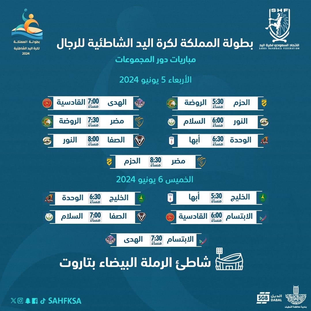 تنطلق غدًا الأربعاء 05 يونيو 2024 م، منافسات الدور التمهيدي من بطولة المملكة لكرة اليد الشاطئية للكبار، بمشاركة 12 ناديًا، تم تقسيمهم على 4 مجموعات.