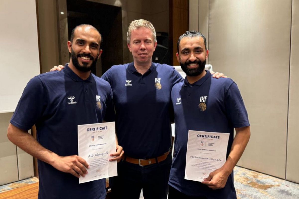 قلد السيد ”بيرمورتن“ رئيس دائرة التحكيم في الاتحاد الدولي لكرة اليد، ثنائي التحكيم السعودي محمد الصقر وعلي السقوفي الشارة الدولية، عقب نجاحهما في تجاوز كافة الاختبارات العملية والتحريرية واللياقية، وتألقهما في ادارة منافسات بطولة العالم لكرة اليد للسيدات تحت «20» عام بمقدونيا.
