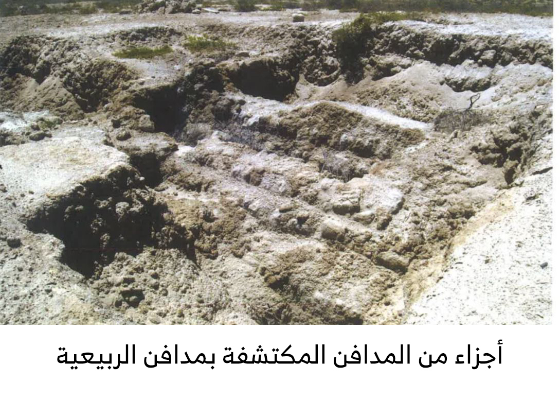 يتكون هذا الموقع من حقل مدافن قديمة على شكل تلال دائرية، بارتفاع يصل إلى 2 متر في بعضها. لقد تم إزالة قسم كبير من هذا الحقل خلال أعمال التوسع الزراعي وإنشاء الطريق الحديث الذي يربط قرية الربيعية بمدينة دارين. مساحة الجزء المسّور من موقع المدافن هي 430 متراً مربعاً. يتميز موقع مدافن الربيعية بطراز معماري فريد في المنطقة الشرقية، وهو عبارة عن مصطبة مستطيلة الشكل ذات بناء متدرج، تتكون من قاعة طويلة مستطيلة. تم إضافة عتبتين حجريتين إلى المدفن، ربما كانتا مسطبة لتقديم القرابين، بينما يحيط بالمدفن الرئيس جدار سميك، وتتصل ببعضها مدافن جانبية. أهم ما عُثر عليه في هذه المدافن هو كسر من أواني فخارية تؤرخ بالفترة بين 2250-1750 ق. م، وقطع برونزية تمثل دبابيس ومسامير ومشابك زينة، إضافة إلى مدافن خاصة تتكون من جرار كبيرة تحوي بقايا عظام دفن تؤرخ بالفترة بين 1550-1950 ق. م. على الرغم من عدم العثور على مواد أثرية ذات قيمة علمية لتحديد تاريخ هذا الموقع بدقة، إلا أن الدراسة الأولية للمعثورات تشير إلى أن الموقع يرجع إلى فترتين، أقدمهما تعود إلى الألف الثالث ق. م، بينما قد تصل الفترة الثانية إلى منتصف الألف الثاني ق. م.