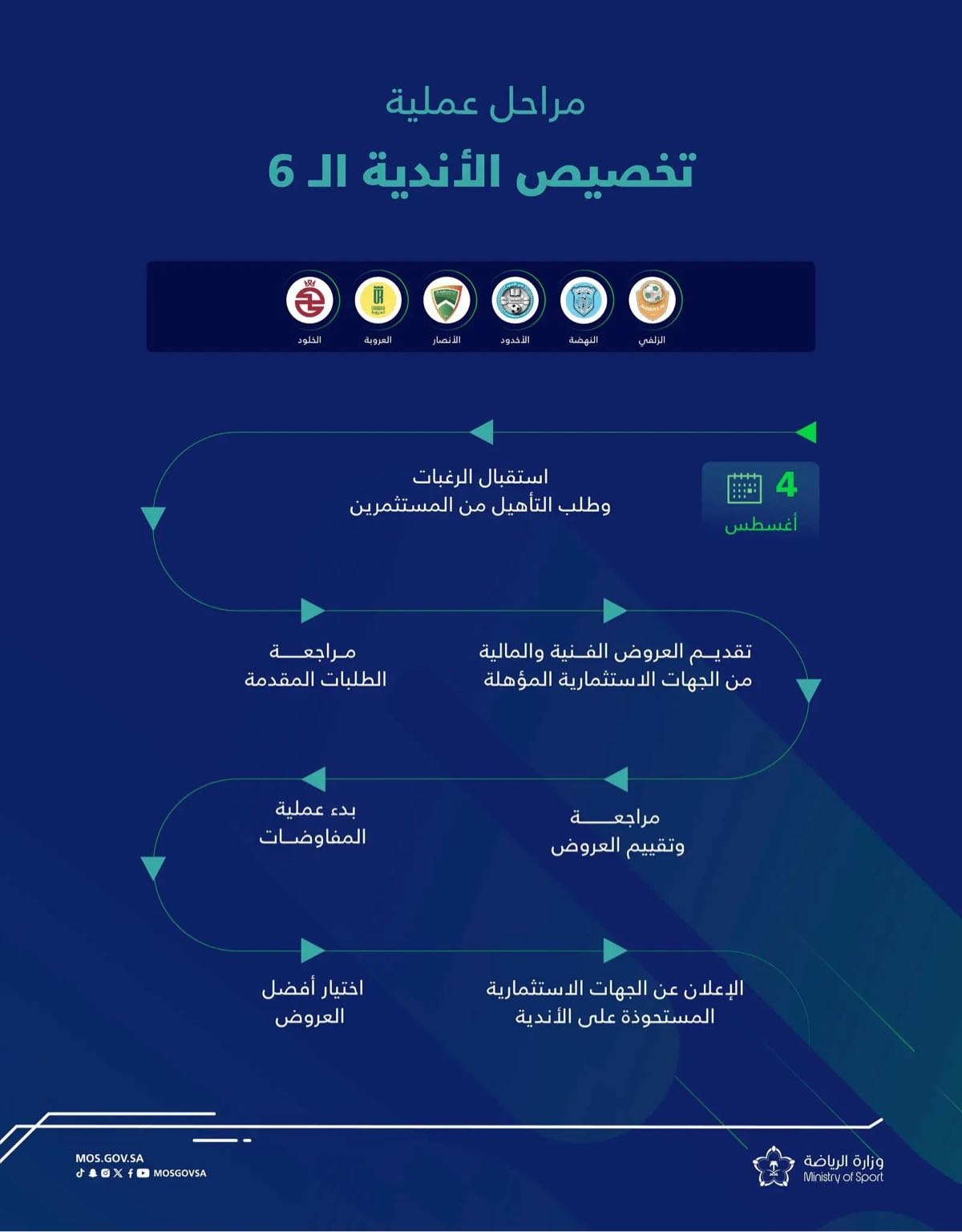 جاء ذلك وفقًا لما أعلنته الوزارة يوم الأربعاء 3 يوليو 2024 م، والمتضمن البدء في المرحلة الثانية من المسار الثاني في مشروع الاستثمار والتخصيص للأندية الرياضية، بناءً على موافقة مجلس الوزراء بتخصيص «14» ناديًا رياضيًا.