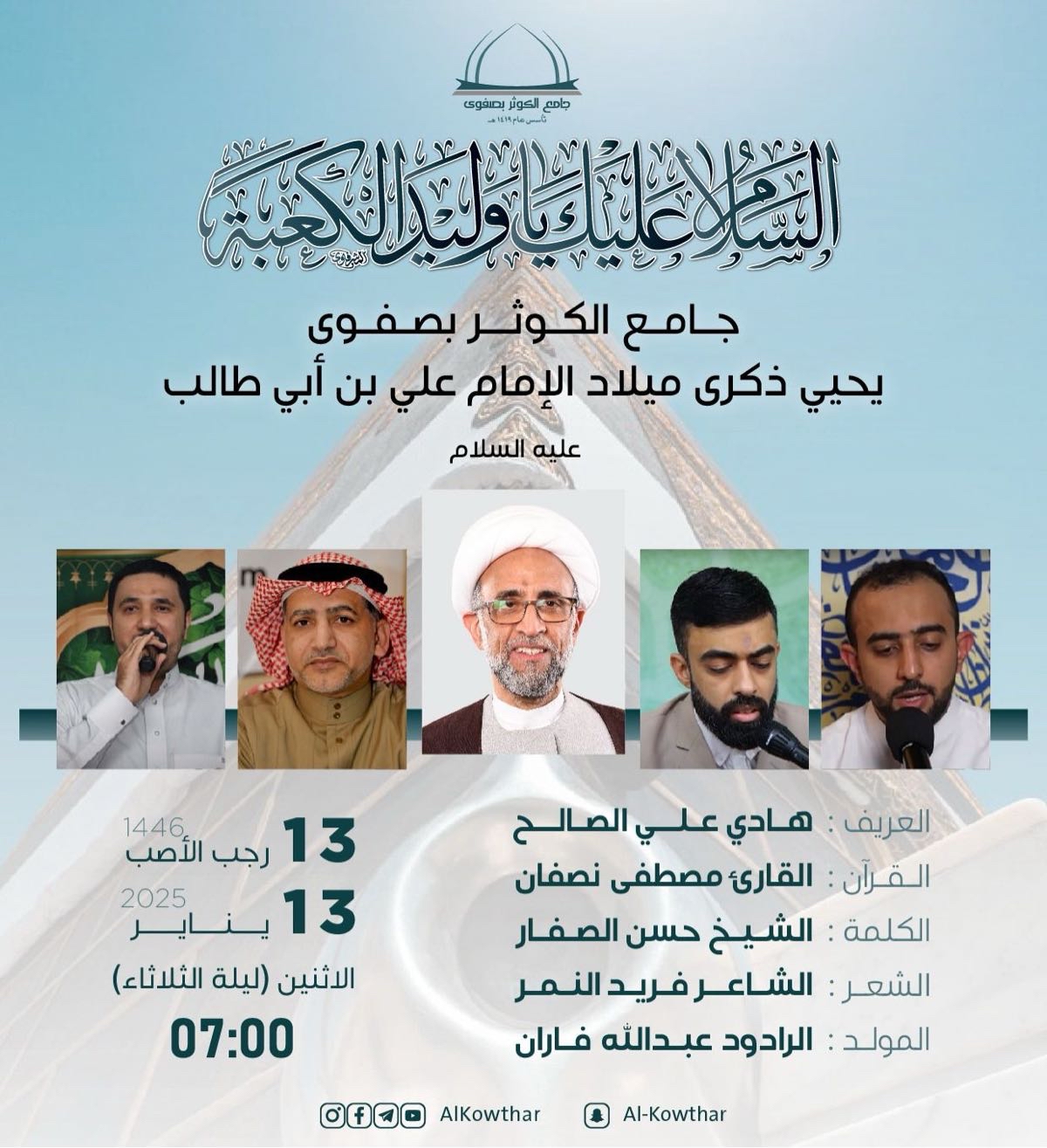 وقد بدأ الحفل الذي قدمه الأستاذ هادي علي صالح، بآيات من الذكر الحكيم تلاها القارئ مصطفى نصفان، ثم مشاركة الشاعر فريد النمر، والرادود عبدالله فاران.