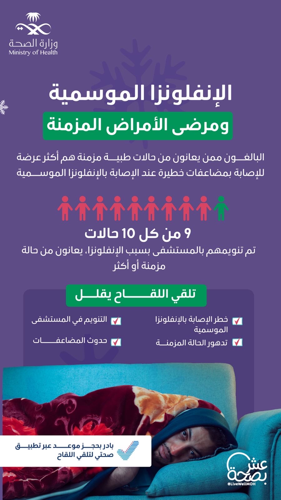 أكدت وزارة الصحة أهمية تطعيم ذوي الأمراض المزمنة ضد الإنفلونزا الموسمية؛ لحمايتهم من المضاعفات الخطيرة وتعزيز سلامتهم، مشيرةً إلى أن 9 من كل 10 حالات منومة في المستشفى بسبب الإنفلونزا، يعانون من حالة مزمنة أو أكثر، بينما يقلل تلقي اللقاح من خطر الإصابة بالإنفلونزا الموسمية.