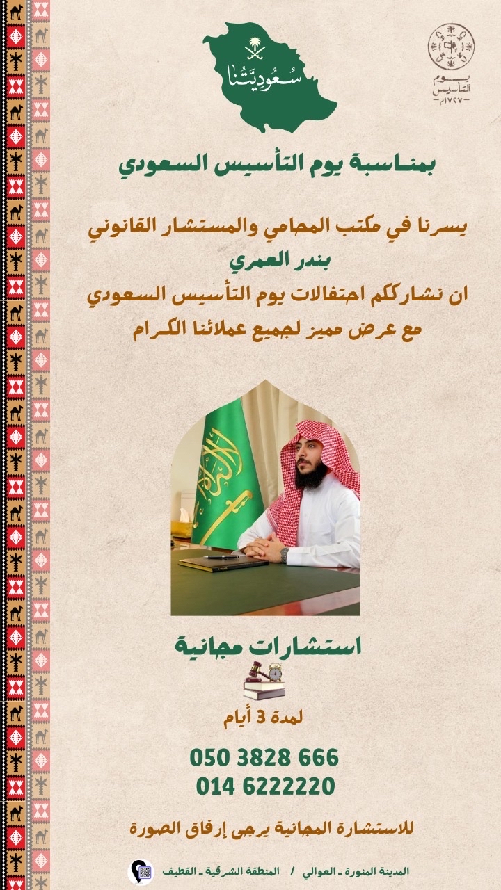 احتفاءً بيوم التأسيس.. 3 أيام استشارات قانونية مجانية لدى مكتب العمري للمحاماة