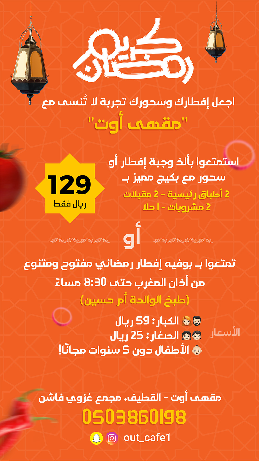 يسرنا استقبالكم في "مقهى أوت" لقضاء أجمل الأوقات مع أشهى الأطباق الرمضانية! 🌙🍽️