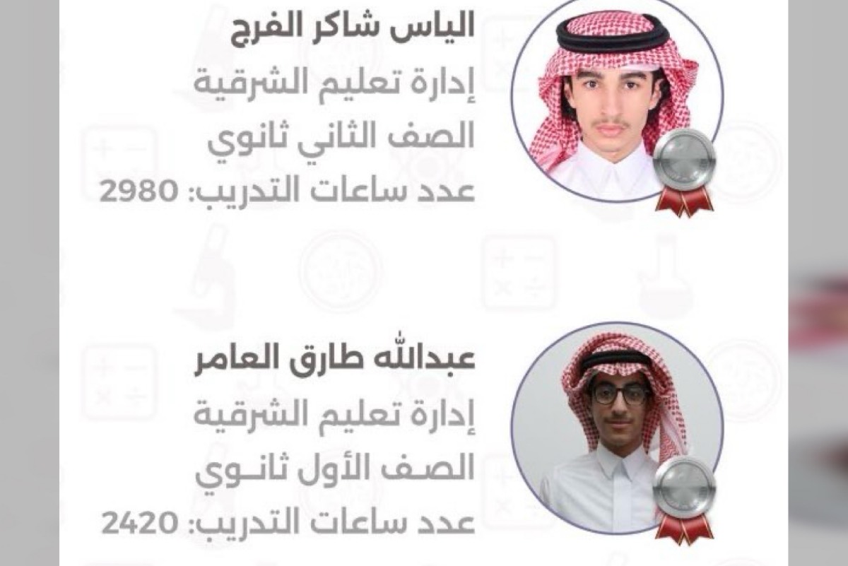 بلغت ساعات التدريب التي خاضها الطالب إلياس الفرج 2980 ساعة تدريبية، فيما استثمر الطالب عبدالله العامر 2420 ساعة تدريبية لصقل مهاراته وقدراته في مجال الرياضيات.