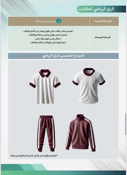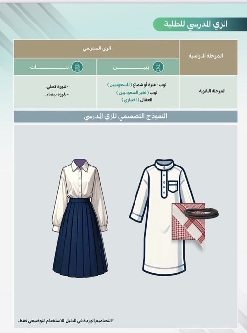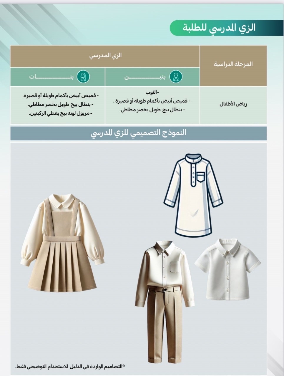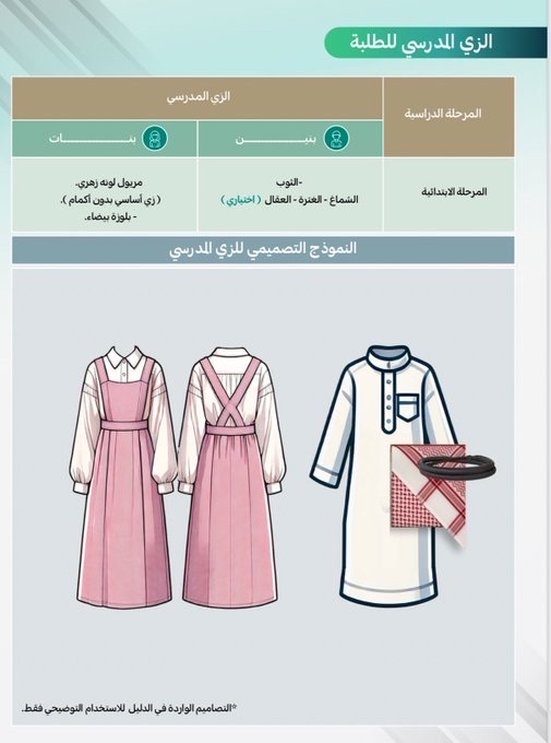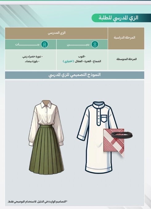 وأشارت إلى أن تطبيق الزي المدرسي للطالبات في جميع المراحل الدراسية بالمدارس الحكومية هو إلزامي. أما الزي الرياضي، فهو إلزامي لجميع الطلبة السعوديين وغير السعوديين في المدارس الحكومية عند ممارسة الأنشطة الرياضية في المواعيد المحددة لذلك.