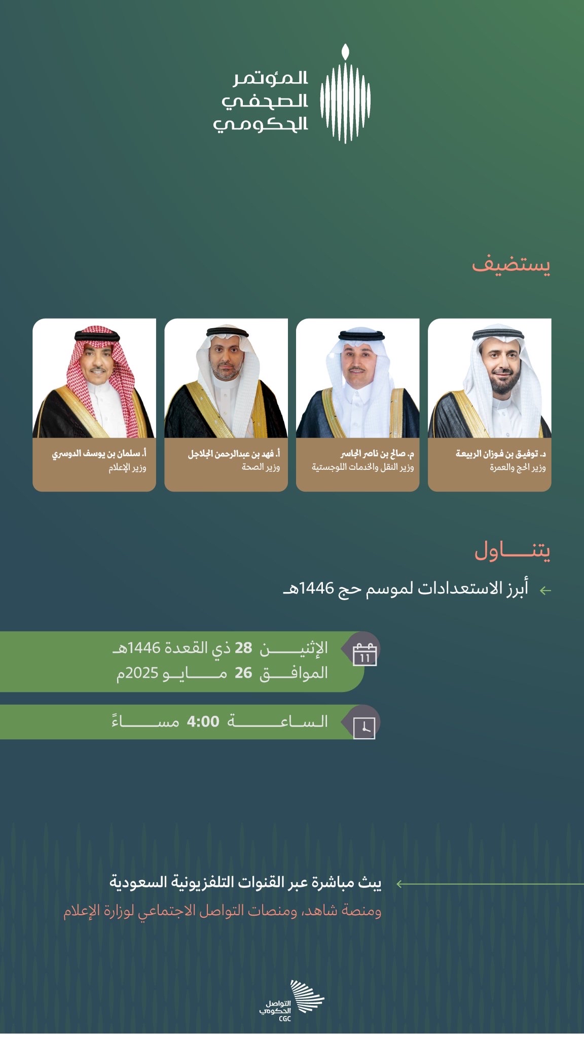يُعقد في العاصمة الرياض، يوم غدٍ الاثنين، مؤتمر صحفي حكومي يجمع كلاً من وزير الحج والعمرة، الدكتور توفيق الربيعة، وزير النقل والخدمات اللوجستية، المهندس صالح الجاسر، ووزير الصحة، فهد الجلاجل، ووزير الإعلام، سلمان الدوسري.