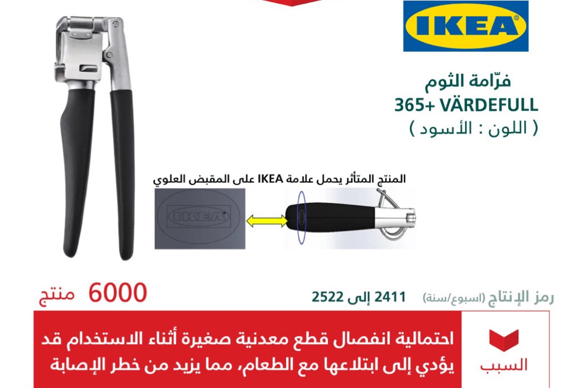 أعلنت وزارة التجارة عن حملة استدعاء واسعة تشمل 6,000 قطعة من فرامة الثوم طراز ”IKEA 365+ VÄRDEFULL“ ذات اللون الأسود، التي تبيعها شركة ”إيكيا“ العالمية، وذلك لوجود خلل مصنعي قد يشكل خطرًا مباشرًا على سلامة المستهلكين.