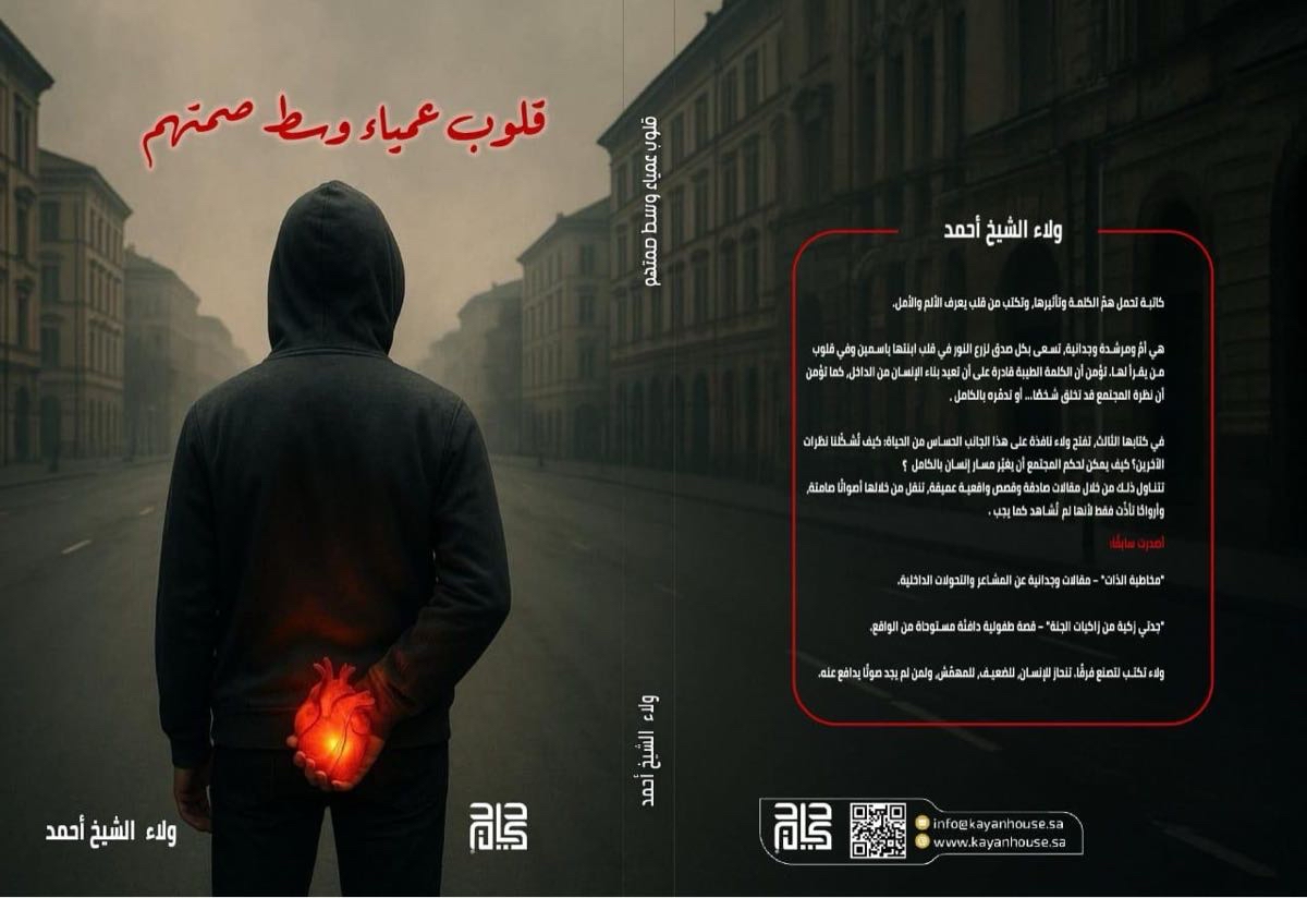 أصدرت الكاتبة ولاء الشيخ أحمد مؤخرًا كتابها الجديد بعنوان ”قلوب عمياء وسط صمتهم“ عن دار كيان للنشر والتوزيع، ليكون العمل الثالث في مسيرتها الأدبية بعد تجربتين لافتتين تركتا بصمتهما في المشهد الثقافي المحلي.