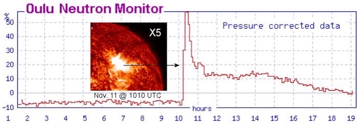 وقذف هذا الانفجار سيلاً من البروتونات عالية الطاقة باتجاه الأرض، حيث تمكنت بعض هذه الجسيمات من اختراق الغلاف الجوي والوصول إلى السطح.