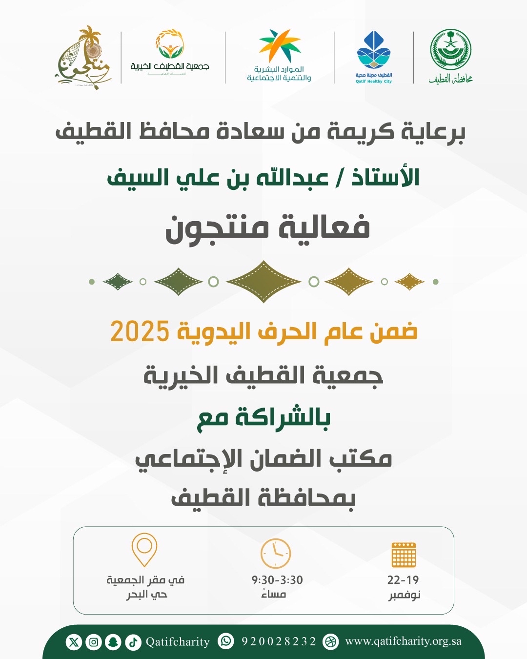 تستعد جمعية القطيف الخيرية لإطلاق فعالية ”منتجون“ للأسر المنتجة، بالتعاون مع مكتب الضمان الاجتماعي بالمحافظة. برعاية محافظ القطيف، عبدالله السيف.