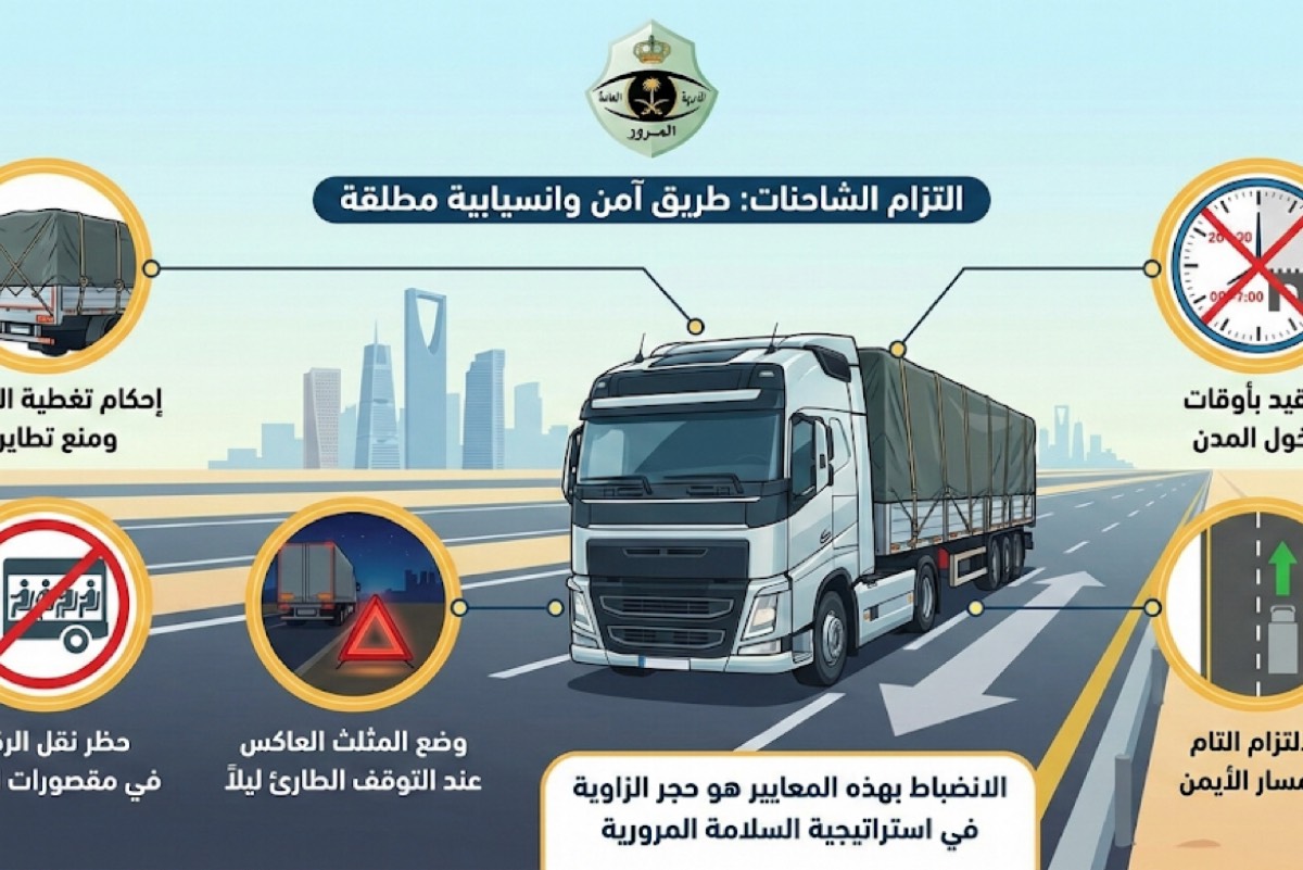 ربطت الإدارة العامة للمرور انسيابية الطرق وخفض معدلات الحوادث في المملكة بالالتزام المطلق لسائقي الشاحنات بخمسة اشتراطات جوهرية، أبرزها التقيد بالمسار الأيمن وأوقات دخول المدن.