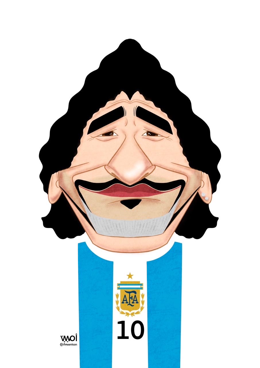 واستطاع الفنان السعودي انتزاع إعجاب لجنة التحكيم عبر بورتريه كاريكاتيري ساخر للأسطورة الأرجنتينية دييغو مارادونا، حيث ركّز العمل على استنطاق الملامح الأيقونية للاعب من خلال مبالغة مدروسة للشعر الكثيف والابتسامة العريضة، معتمداً على اختزال الجسد لصالح قوة تعبير الوجه.