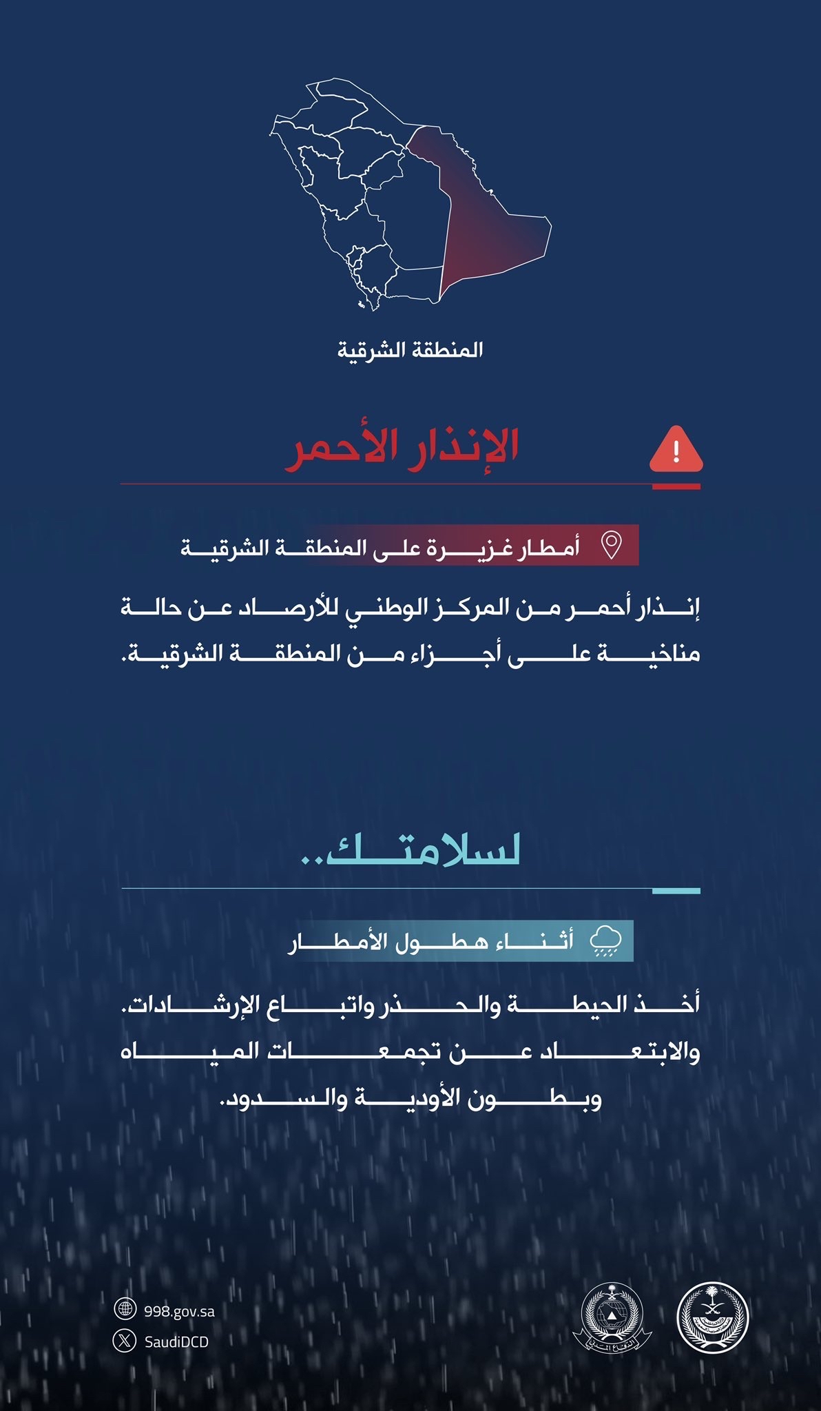 أطلقت المديرية العامة للدفاع المدني تحذيرات لسكان المنطقة الشرقية بضرورة توخي الحيطة والحذر الشديدين، عقب إصدار المركز الوطني للأرصاد ”الإنذار الأحمر“ الذي ينبئ بهطول أمطار غزيرة على أجزاء واسعة من المنطقة، داعية الجميع إلى التقيد بتعليمات السلامة والابتعاد الفوري عن أماكن تجمع السيول حفاظاً على الأرواح.