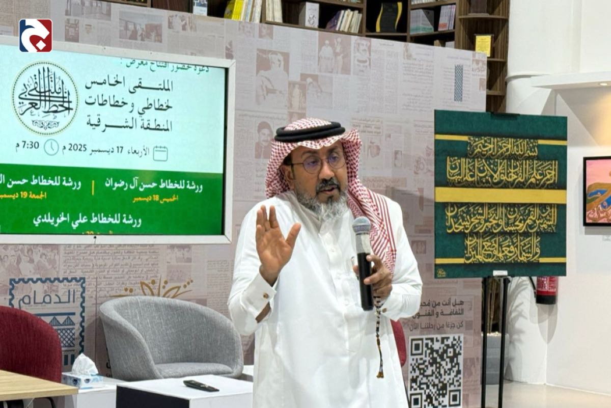 دشنت الجمعية العربية السعودية للثقافة والفنون بالدمام فعاليات ”الملتقى الخامس لخطاطي وخطاطات المنطقة الشرقية“، مساء الأربعاء الماضي، بورشة عمل نوعية للخطاط حسن آل رضوان.