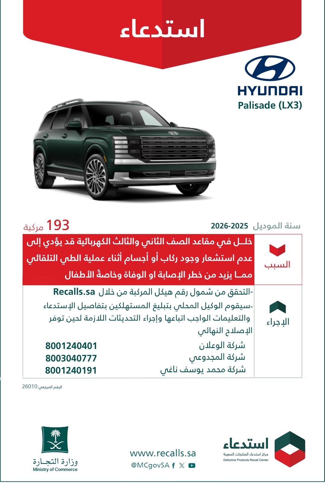 أعلنت وزارة التجارة عن استدعاء 193 مركبة من طراز ”هيونداي باليسيد“ لموديلات 2025 و 2026، لوجود خلل مصنعي خطير في طي المقاعد يهدد حياة الركاب والأطفال، داعية للتحقق من رقم الهيكل فوراً.