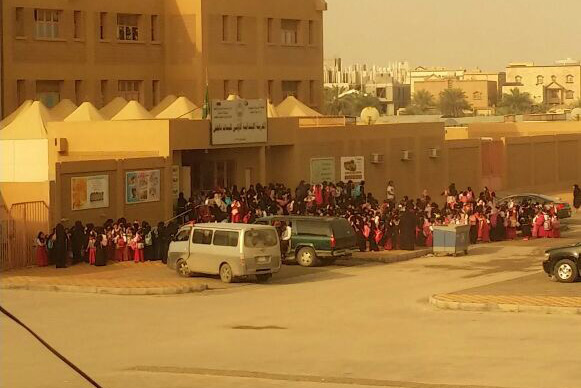 وتجمعت الطالبات خارج اسوار المدرسة فيما اجرى عدد من المعلمات اتصالات بذويهن وحضر بعض أولياء الامور بعد سماع صوت الانذار وخروج الطالبات.