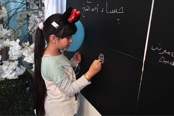تفاعل زوار خيمة جمعية سيهات للخدمات الاجتماعية مع حائط الوفاء بتسجيل أسماء وعبارات رسخت في أذهانهم في عالم التطوع.