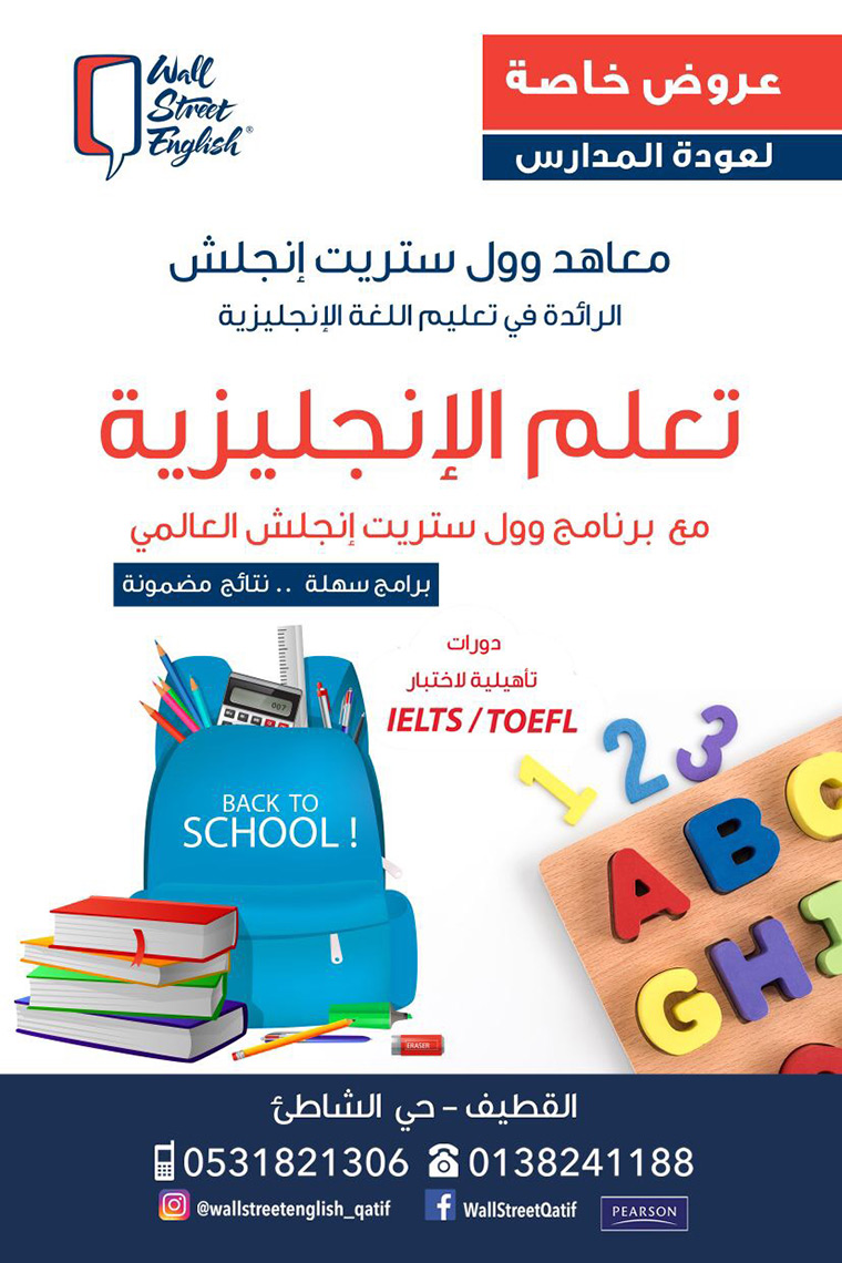 عروض خاص لعودة المدارس في برامج وول ستريت للغة الإنجليزية بالقطيف
