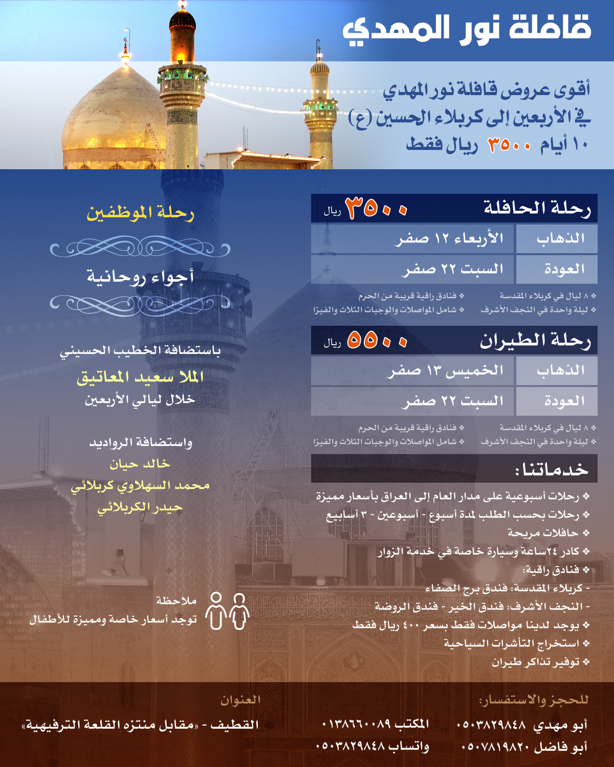 قافلة نور المهدي تعلن عن عروضها الخاصة لزيارة الأربعين والمدينة المنورة