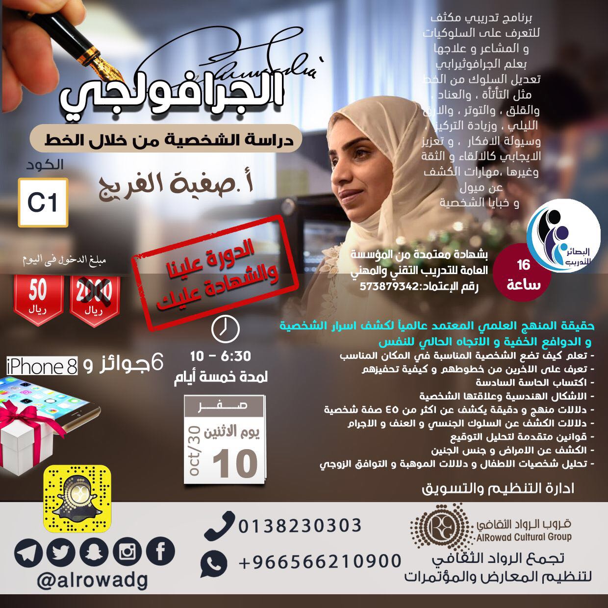 🎁 6 جوائز وآيفون 8📱ومبلغ دخول💰 50 ريال فقط في اليوم بدورة دراسة الشخصية من خلال خط اليد الجرافولوجي 📝 للأستاذة صفية الفريج 🔑 والتي ستقام في قاعة تجمع الرواد الثقافي لتنظيم المعارض والمؤتمرات بحي الشاطئ.