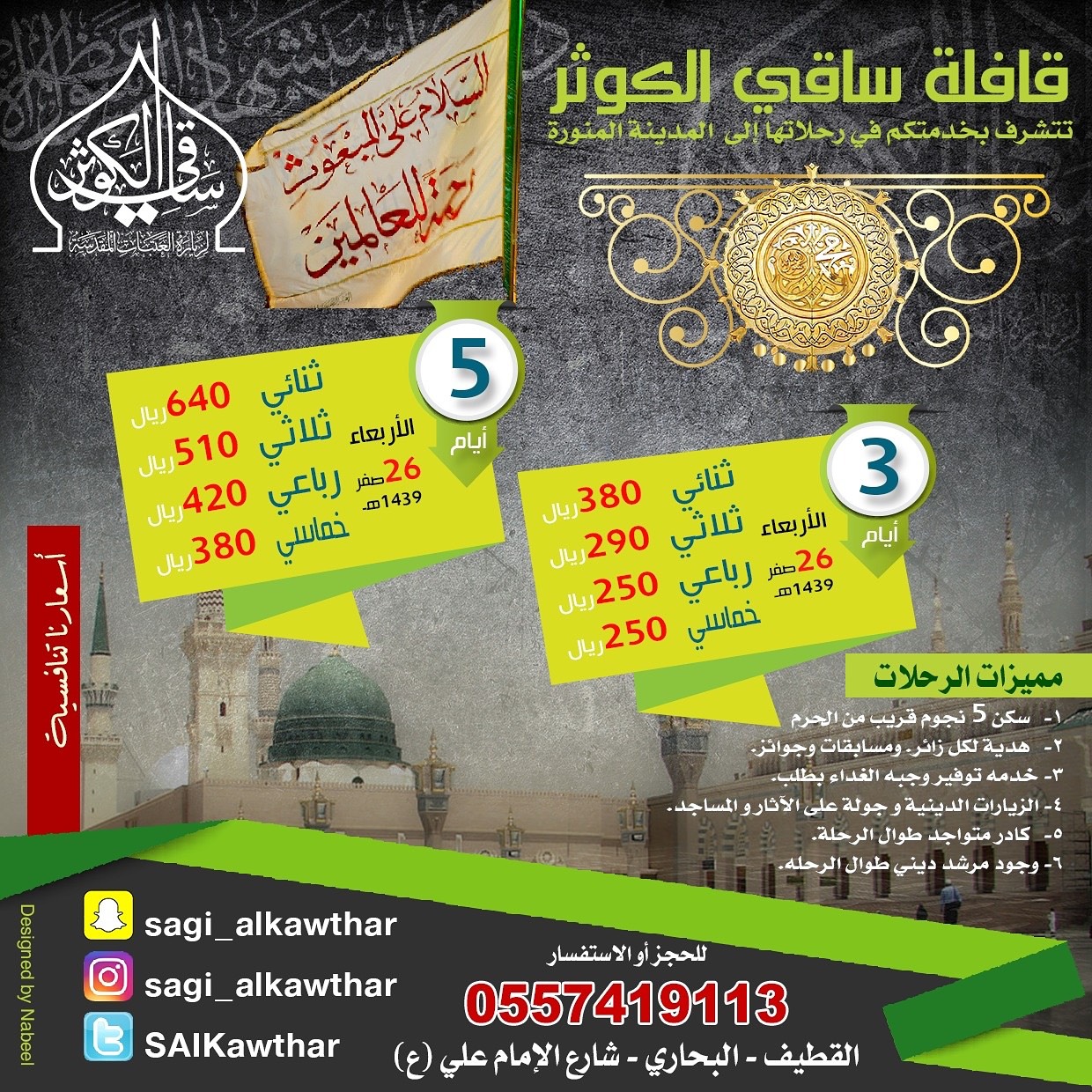 تعلن قافلة ”ساقي الكوثر“ عن رحلاتها للمدينة المنورة في ذكرى وفاة النبي (ص) بأسعار تنافسية جدا