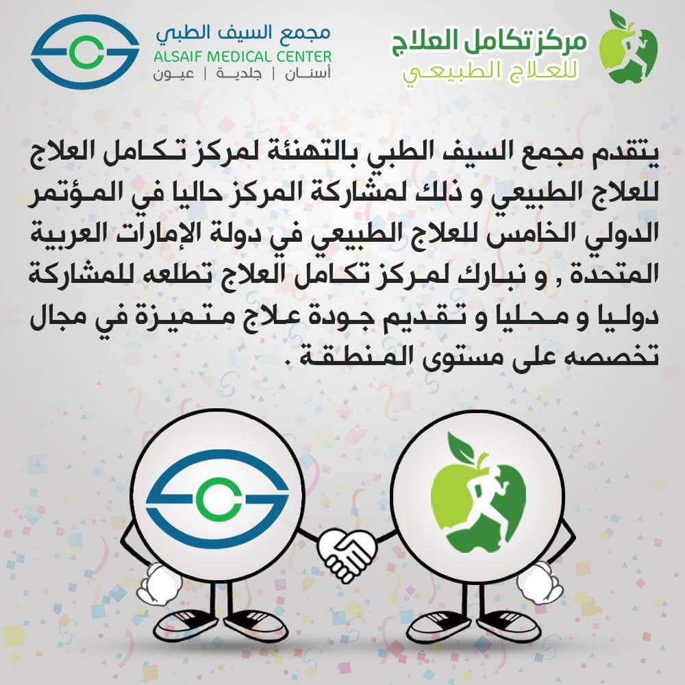 يتقدم مجمع السيف الطبي بالتهنئة لمركز تكامل العلاج للعلاج الطبيعي وذلك لمشاركة المركز حاليا في المؤتمر الدولي الخامس للعلاج الطبيعي في دولة الإمارات العربية المتحدة، ونبارك لمركز تكامل العلاج تطلعه للمشاركة دوليا ومحليا وتقديم جودة علاج متميزة في مجال تخصصه في المنطقة.