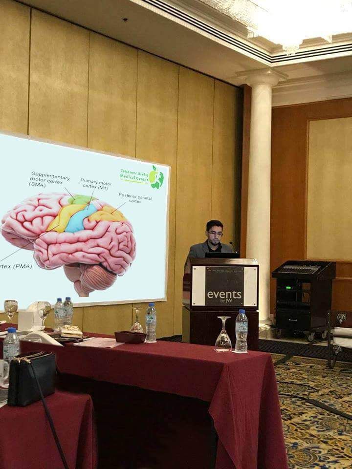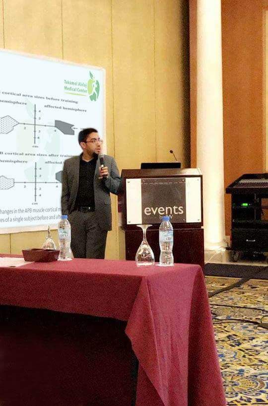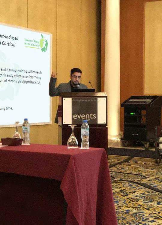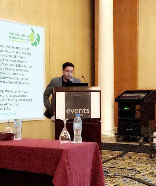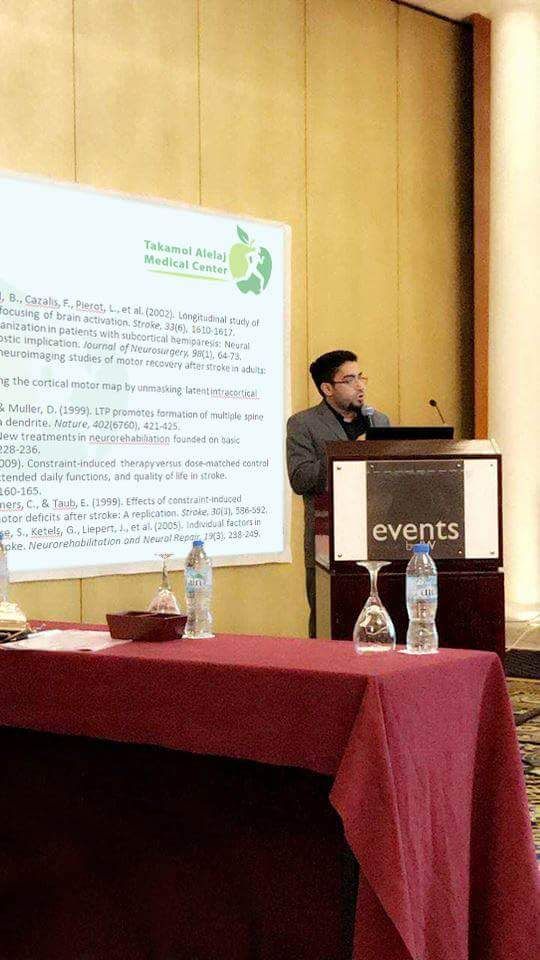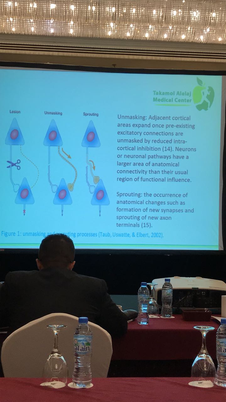 لمشاركة مركز تكامل العلاج في المؤتمر الدولي الخامس للعلاج الطبيعي في دولة الإمارات العربية المتحدة وتم إلتقاط الصور أثناء تحدث الأخصائي إبراهيم المغسل عن تأهيل الجلطة الدماغية .
