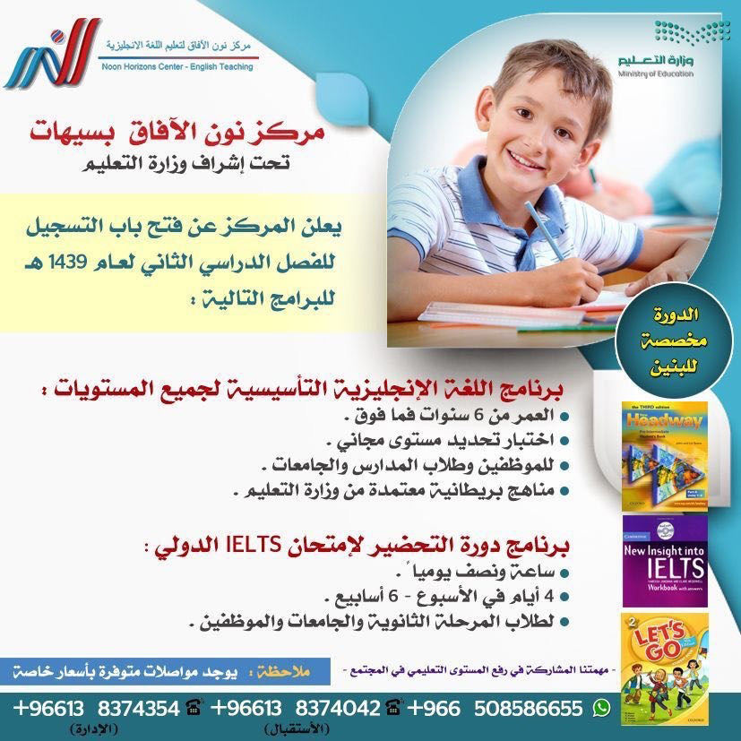 يعلن مركز نون الآفاق لتعليم اللغة الإنجليزية بسيهات عن فتح باب التسجيل للفصل الدراسي الثاني لعام 1439 هـ للبرامج التالية:
