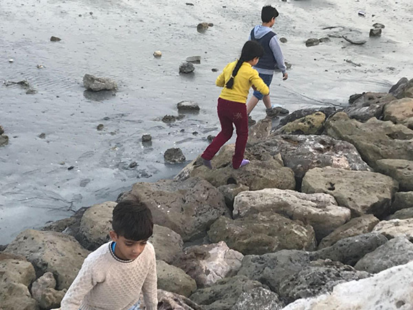 وقال بعض الاطفال: ”لانخشى وصول المد الان، وننزل الى ارض الشاطيء كي نتسلى ونجمع بعض القواقع“.