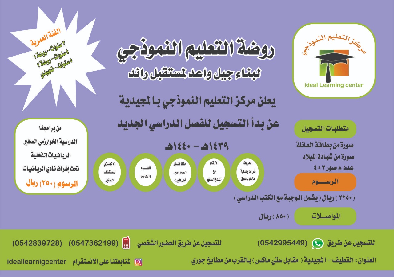 روضة التعليم النموذجي بالمجيدية تعلن عن استمرار تسجيل للفصل الدراسي الأول لعام 1439 - 1440
