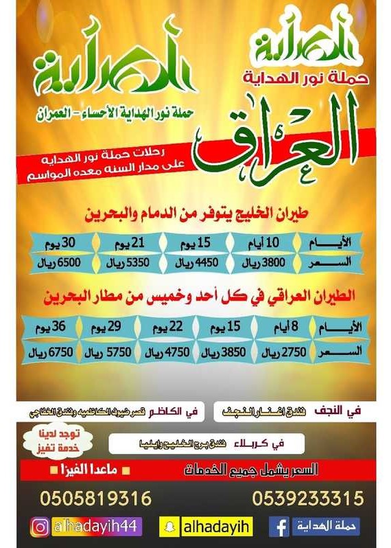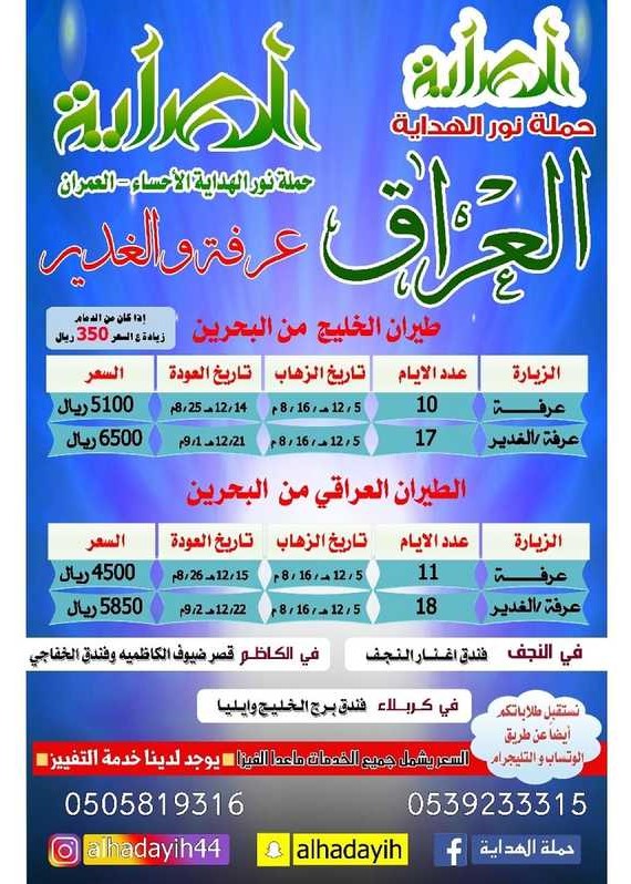 تعلن حملة نور الهداية بالاحساء عن تسيير رحلاتها للعراق في عرفة وعيد الغدير ..